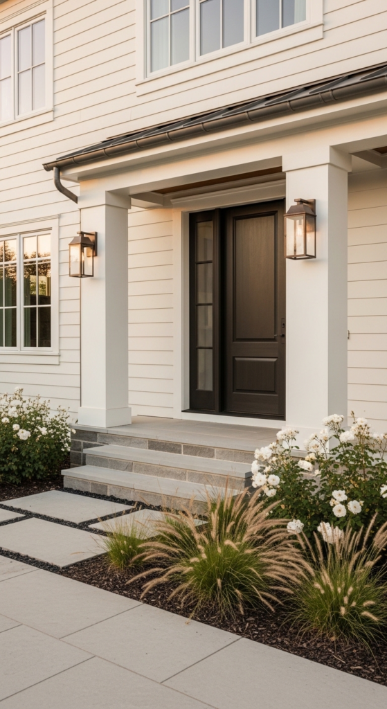 Warm off-white paired with weathered bronze lanterns and fixtures — understated luxury.