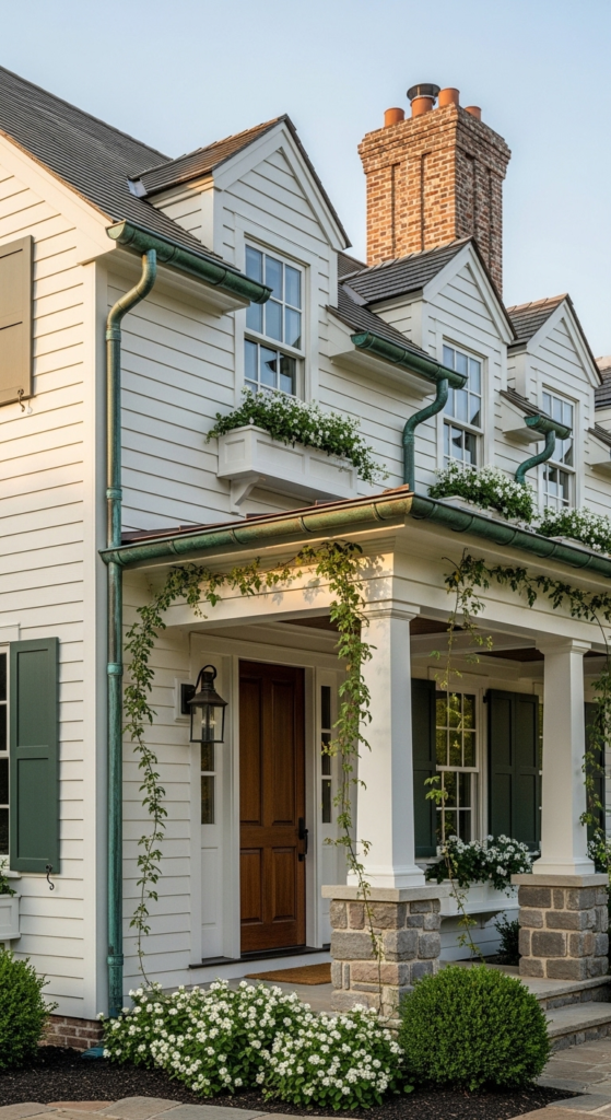 Aged copper gutters against warm white siding — unexpected detail, unforgettable look.