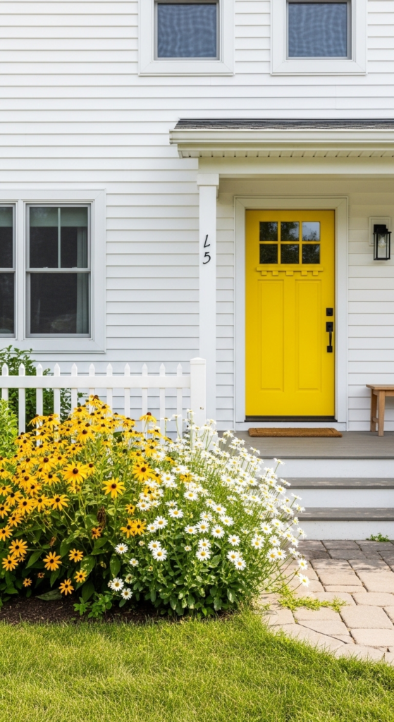 A cheerful yellow front door on cotton white siding — sunny, charming, memorable.