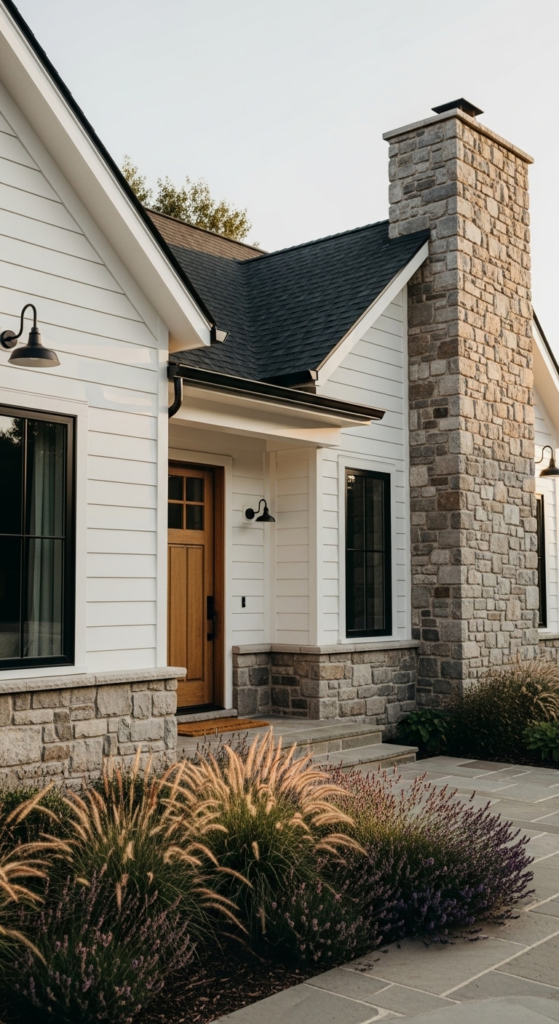 White siding with stone accent walls brings earthy texture and natural depth.