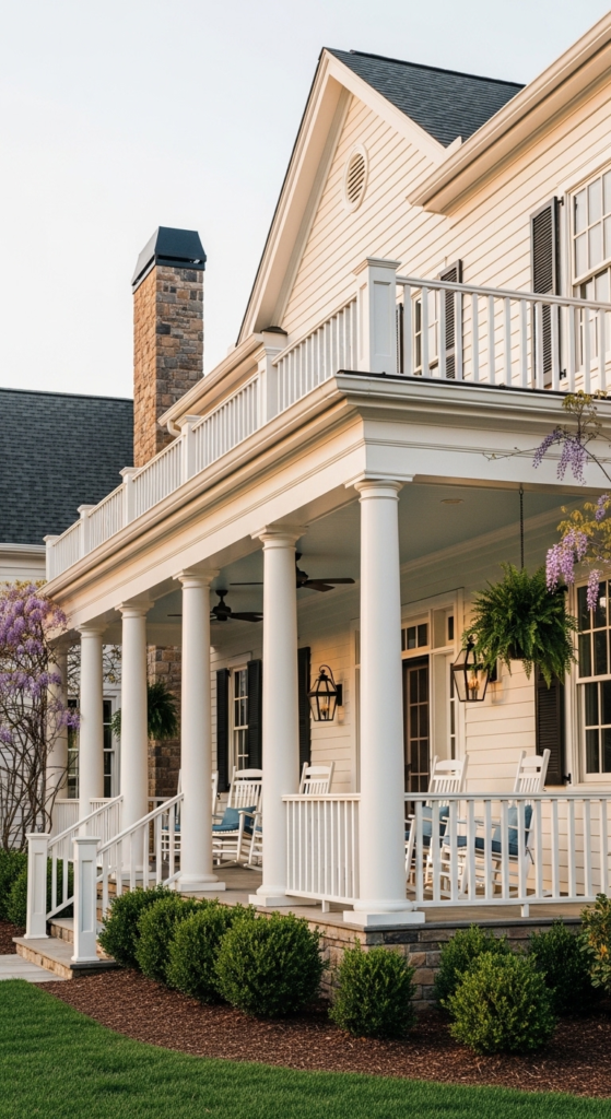 A deep wraparound porch in creamy white — the ultimate southern farmhouse dream.