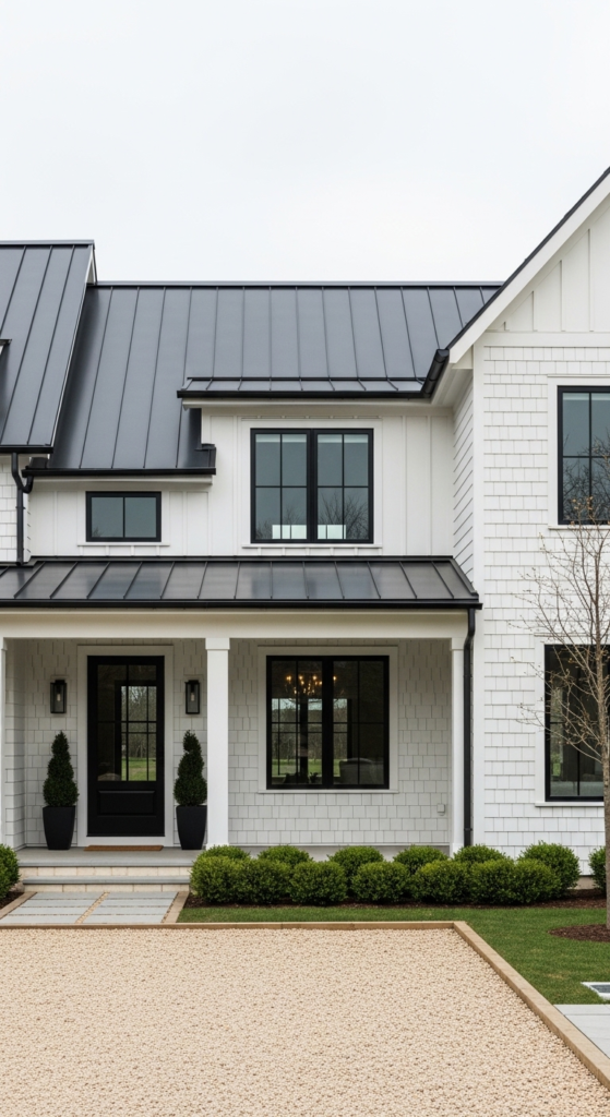 Bright snowflake white walls beneath a standing seam metal roof — sharp and stunning.