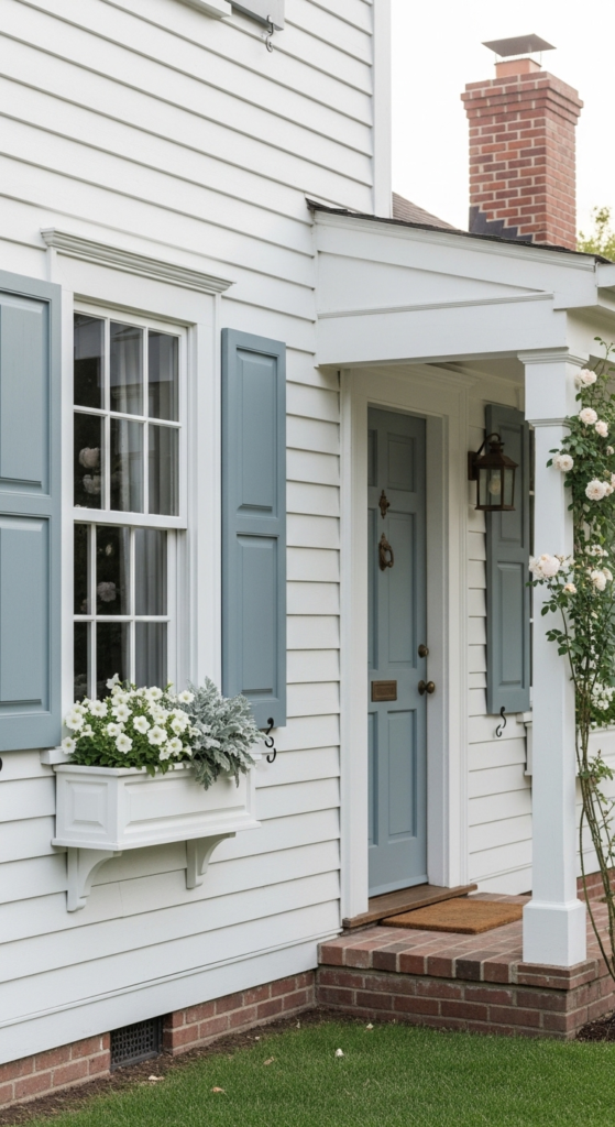 Dusty blue shutters on white siding — gentle, vintage, effortlessly beautiful.