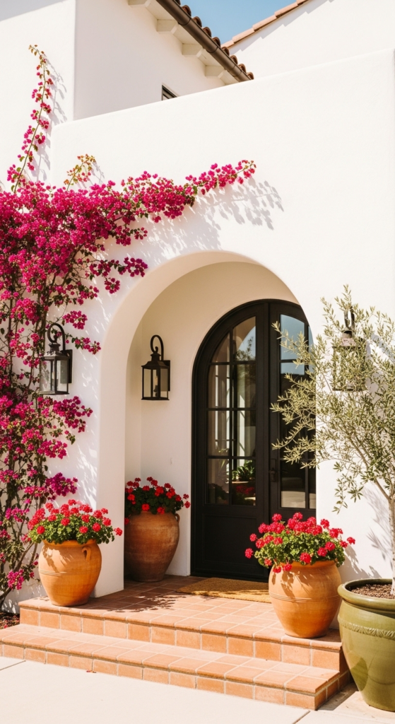 Mediterranean farmhouse — white stucco walls layered with terracotta and greenery.