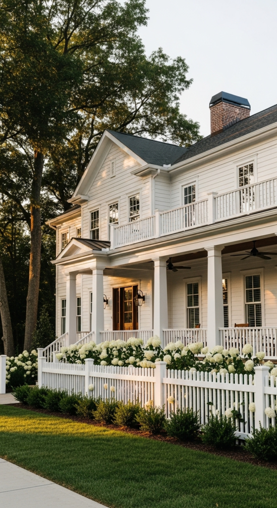 Every element in white — siding, trim, porch, fence — pure timeless perfection.
