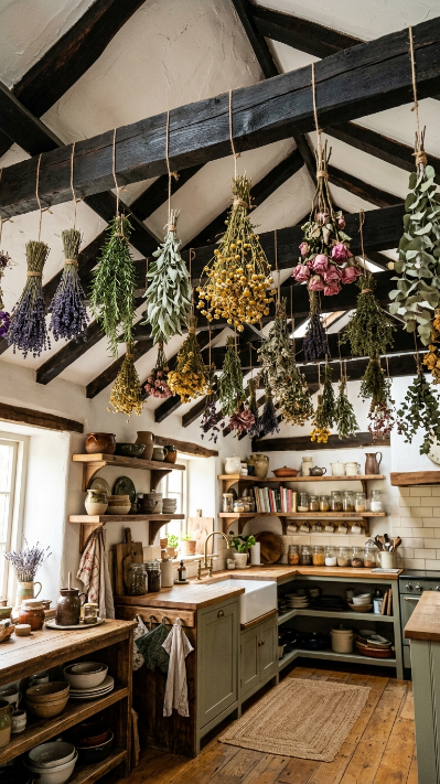 Bundles of dried herbs and flowers hanging from the kitchen ceiling beams are wildly beautiful and fragrant.