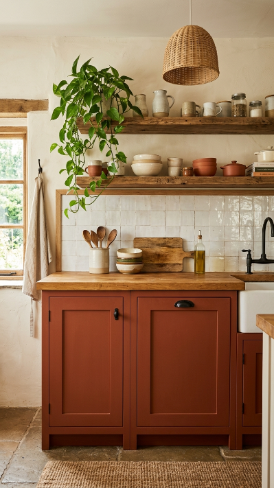 Unexpected cabinet colors — terracotta, sage, dusty blue, or ochre — make the boho farmhouse kitchen completely unique.