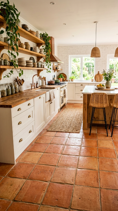 Warm terracotta floor tiles ground the boho farmhouse kitchen in earthy, sun-soaked Mediterranean beauty.