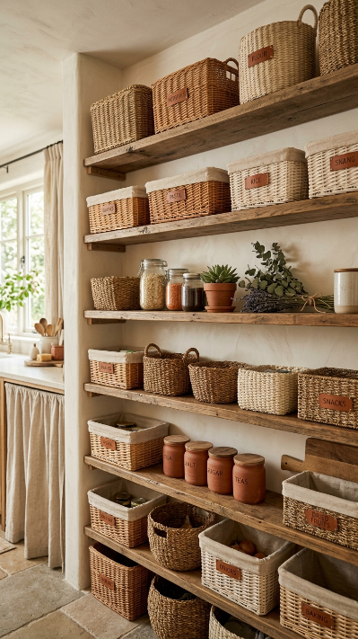 A wall of woven baskets used as open pantry storage is endlessly charming boho farmhouse organization.