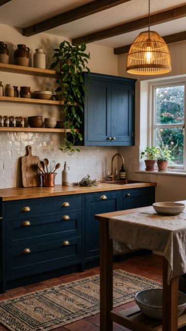 Deep midnight blue cabinetry with brass hardware and warm timber gives the boho farmhouse kitchen serious drama.