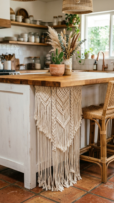 A macramé or fringe table skirt on the kitchen island base adds unexpected boho texture and whimsy.