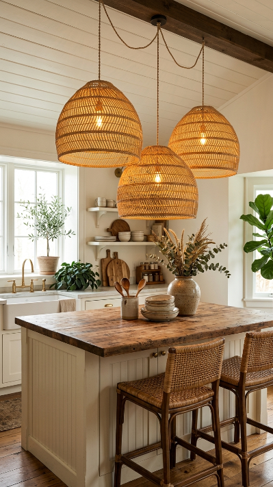 A cluster of oversized woven rattan or seagrass pendant lights above the island is pure boho magic.