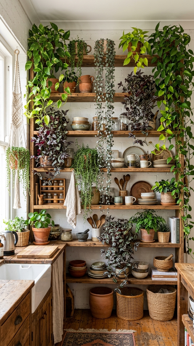 Every open shelf edge drips with trailing plants — the kitchen becomes a living, breathing indoor jungle.