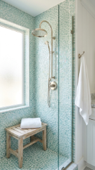 A shower tiled in soft sea glass greens, aquas and whites creates a coastal farmhouse bathroom that feels like stepping inside a wave.