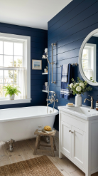 Deep navy painted shiplap or walls with crisp white fixtures and fittings creates a bold coastal farmhouse bathroom of striking nautical beauty.