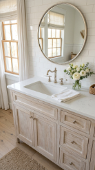A whitewashed or limed wood vanity cabinet in the bathroom brings warm, sun-bleached coastal farmhouse texture and softness to the most used surface in the room.