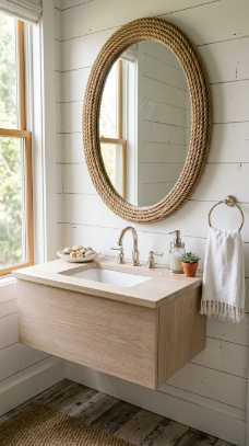 A large mirror with a thick nautical rope frame above a white vanity is the most beautifully understated coastal farmhouse bathroom statement.
