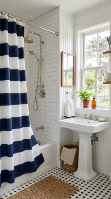 A navy and white or blue and natural linen stripe shower curtain on a simple black iron or nickel rod is the easiest and most effective coastal farmhouse bathroom update.