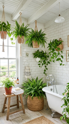 Lush green ferns and trailing plants against crisp white tile walls bring the garden and the coast together in the most refreshing coastal farmhouse bathroom combination.