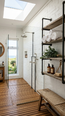 Bringing the aesthetic of an outdoor coastal shower inside — teak floors, open shelving, organic textures — creates a bathroom with total barefoot living energy.