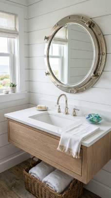 A round porthole-style mirror with a nickel or brass ring frame above the vanity brings the most beautifully nautical coastal farmhouse bathroom detail.