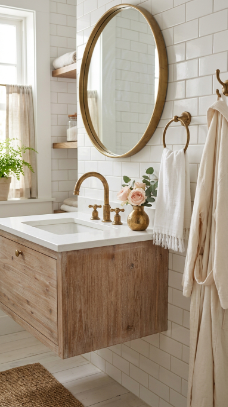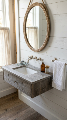 A floating vanity in weathered grey or driftwood-toned reclaimed wood is the coastal farmhouse bathroom’s most authentic and sculptural furniture piece.