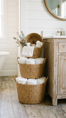 Woven seagrass baskets in varying sizes used for towel and bathroom storage are beautiful, functional coastal farmhouse bathroom accessories.