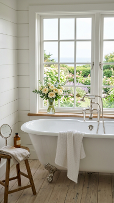 A white clawfoot tub positioned directly beside a large window with a coastal or garden view is the ultimate coastal farmhouse bathroom aspiration.