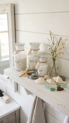 Open shelving styled with glass apothecary jars, smooth beach stones, shell collections and coastal botanicals creates the most personal coastal farmhouse bathroom display.