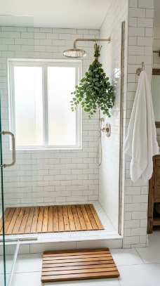 A teak wood slatted shower floor or bath mat brings warm, boat-deck coastal farmhouse texture into the bathroom underfoot in the most beautiful way.