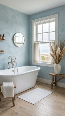 Soft coastal blue limewash painted bathroom walls with a beautiful watercolor texture feel like the sea came inside and stayed.