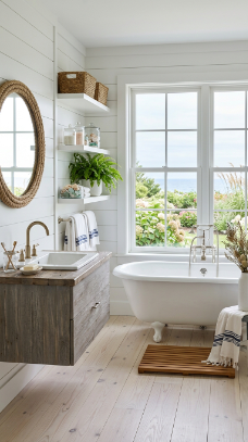 If there’s one room in the home that deserves to feel like a breath of salt air and morning light, it’s the bathroom. Coastal farmhouse style transforms even the most ordinary bathroom into something genuinely restorative — where whitewashed wood, soft sea-toned tile, rope details, and the gentle glow of natural light make every single morning feel like the start of something good.
