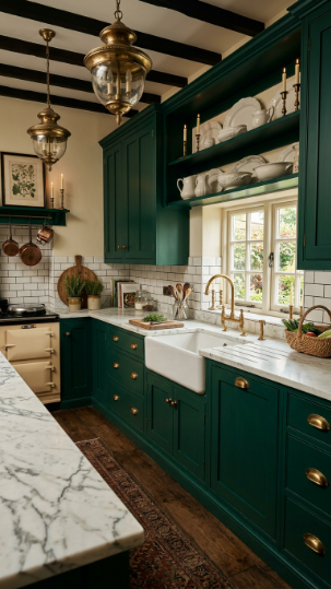 Rich emerald cabinetry with aged brass pulls — opulent, dramatic, and deeply Victorian.