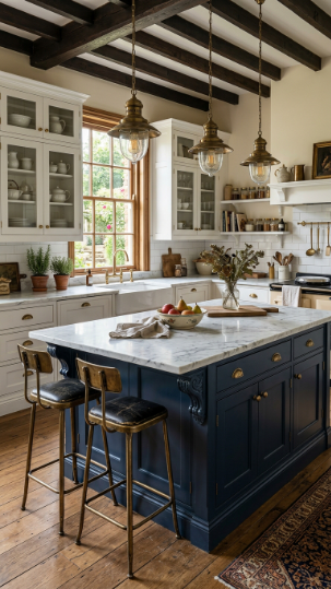 A bold navy kitchen island with thick white marble — Victorian drama meets farmhouse function.