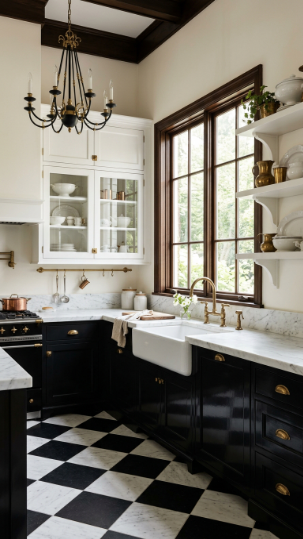 Glossy black lower cabinets, white uppers, and black and white tile floors — timeless Victorian contrast.