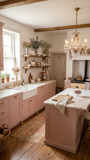 Soft Victorian dusty rose cabinetry with antique gold hardware — romantic, feminine, and utterly unique.