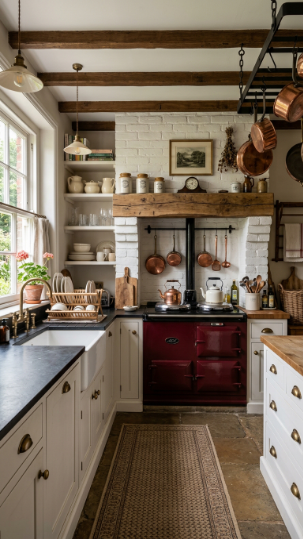 A classic AGA range cooker in deep burgundy anchors the kitchen with Victorian cooking tradition.