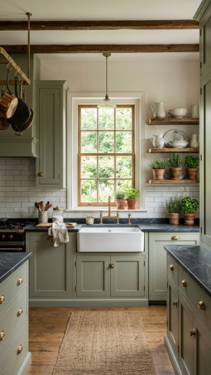 Muted sage green cabinetry with dark soapstone countertops — earthy, sophisticated, and beautiful.