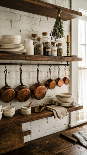 Reclaimed wood open shelves styled with antique ironstone and copper — warm, collected, and Victorian.