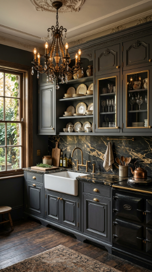 Deep charcoal grey cabinetry with antique gold accents — dark, moody, and dramatically Victorian.