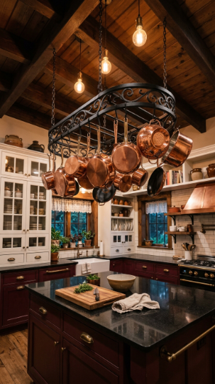 17. Victorian Kitchen with Pot Rack and Copper Pans