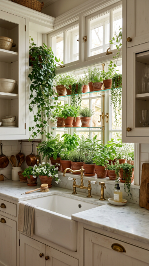 A glass greenhouse window shelf above the sink overflowing with herbs and trailing plants — romantic and alive.