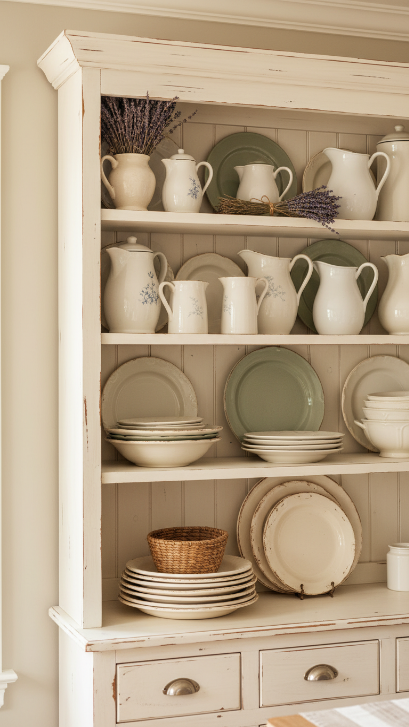 Styling Tips: Think about color cohesion inside the cabinet. Group your pieces by color family rather than type — all the blue transferware together, all the creamy white pieces together. Add a small potted herb or a single stem in a bud vase on top to draw the eye upward.
