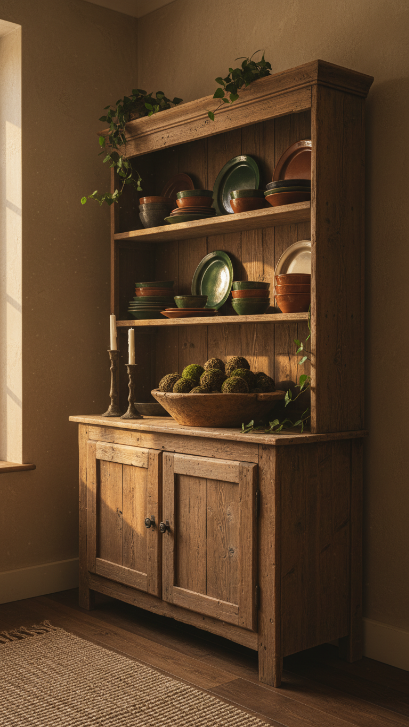 There’s a warmth to reclaimed wood that no manufactured piece can replicate. Every knot, every crack, every variation in grain tells a story, and when that wood is shaped into a hutch, it becomes the most interesting thing in any room. This style pairs beautifully with hammered metal hardware, stoneware in earthy tones, and a collection of mismatched candlesticks in varying heights.