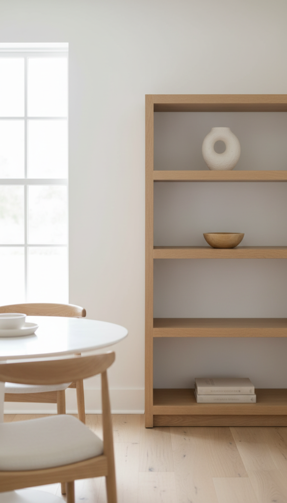 Styling Tips: Edit ruthlessly. If you put something on the shelf, it should be something you find genuinely beautiful every single time you look at it. Three objects arranged with care will always look better than fifteen items crammed together. A single large-scale piece — a wide-mouthed ceramic vase, a sculptural wooden bowl — can anchor a shelf beautifully on its own.
