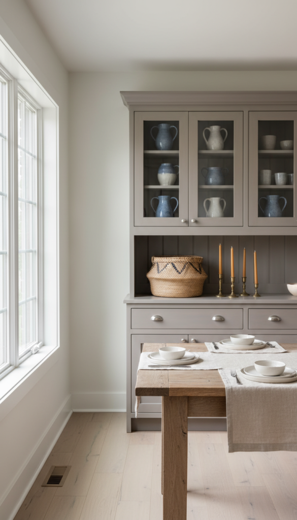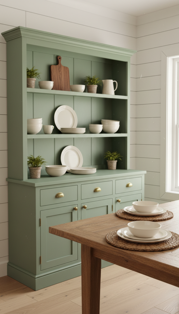 A soft, nature-inspired sage green hutch brings the calm of a garden inside, making your dining room feel like a breath of fresh air.