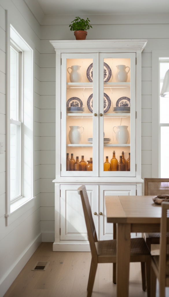 Add soft interior lighting to a farmhouse hutch and every evening your dining room gets its own golden hour.