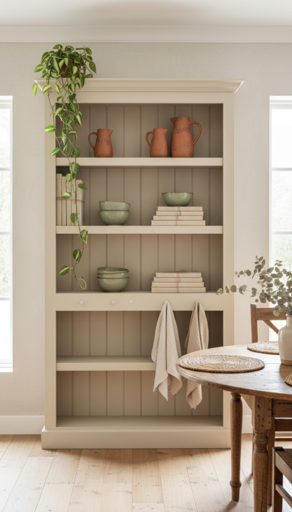 Color Suggestions: Warm white shelving, terracotta accents, sage green, natural linen tones.