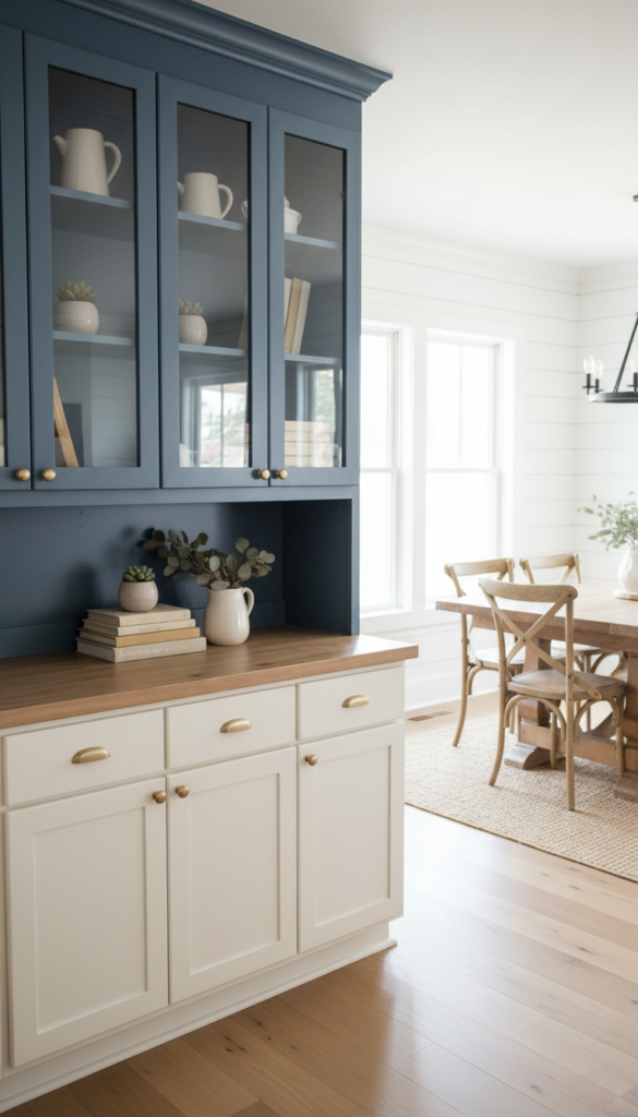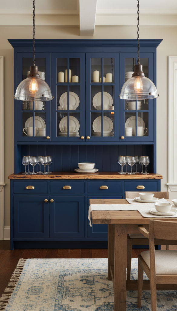 If you’re ready to move past safe neutrals, a navy blue hutch is your answer. It’s dramatic enough to make a statement but sophisticated enough to feel intentional rather than trendy. Navy grounds a space beautifully and makes everything displayed inside it pop — especially white dishware, gold accents, and natural wood elements.