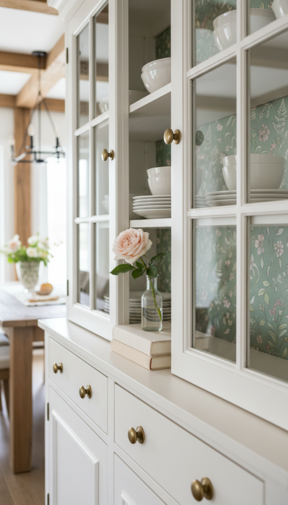 Using removable wallpaper or a beautiful wallpaper remnant on the back panel of a hutch is one of the most transformative — and underrated — decorating tricks in farmhouse design. A botanical print, a soft watercolor stripe, or a vintage floral can turn an ordinary hutch into a truly extraordinary piece of furniture that looks completely custom.